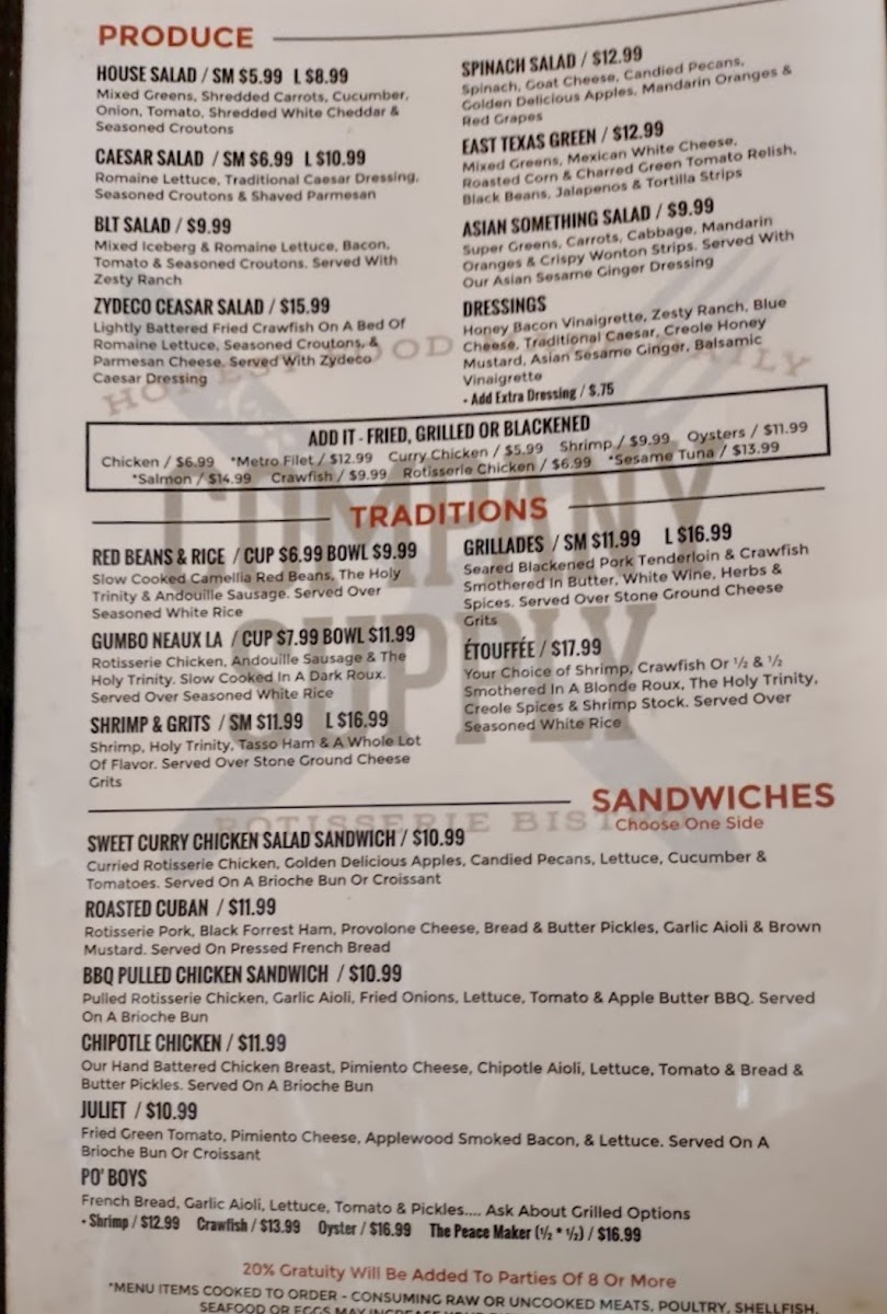 Honey Bacon Vinaigrette, Ranch, Blue Cheese, Zydeco Caesar, Traditional Caesar, Creole Honey Mustard, Asian Sesame Ginger, Balsamic Vinaigrette